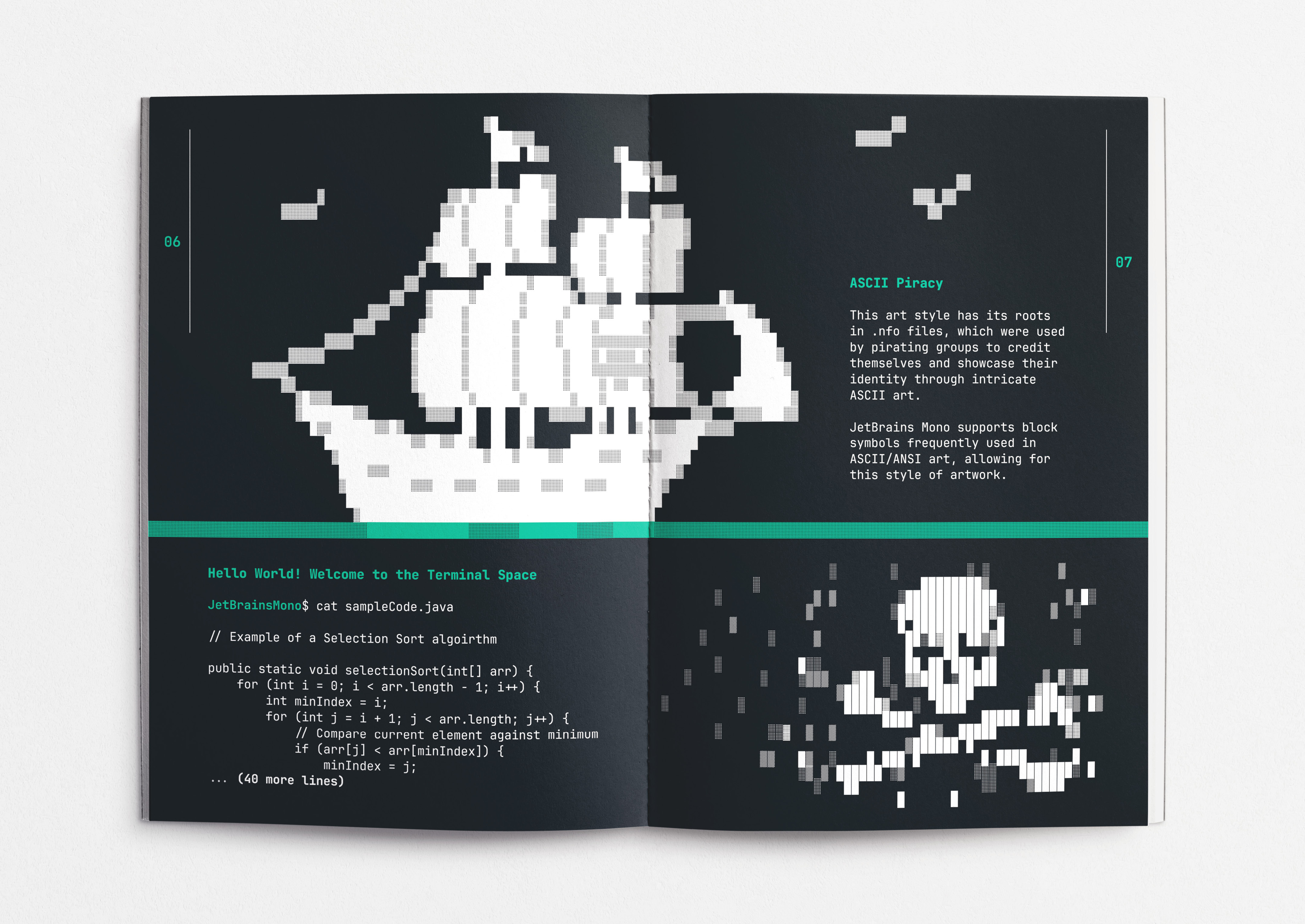 The final result was a really clean and cohesive design that showcased the JetBrains Mono's unique use cases. The spread highlighting art in digital piracy really captured the typeface's artistic yet functional qualities, and the 3D-printed artifact also generated a significant interest among peers, acting as a fidget toy with its interactive keys.